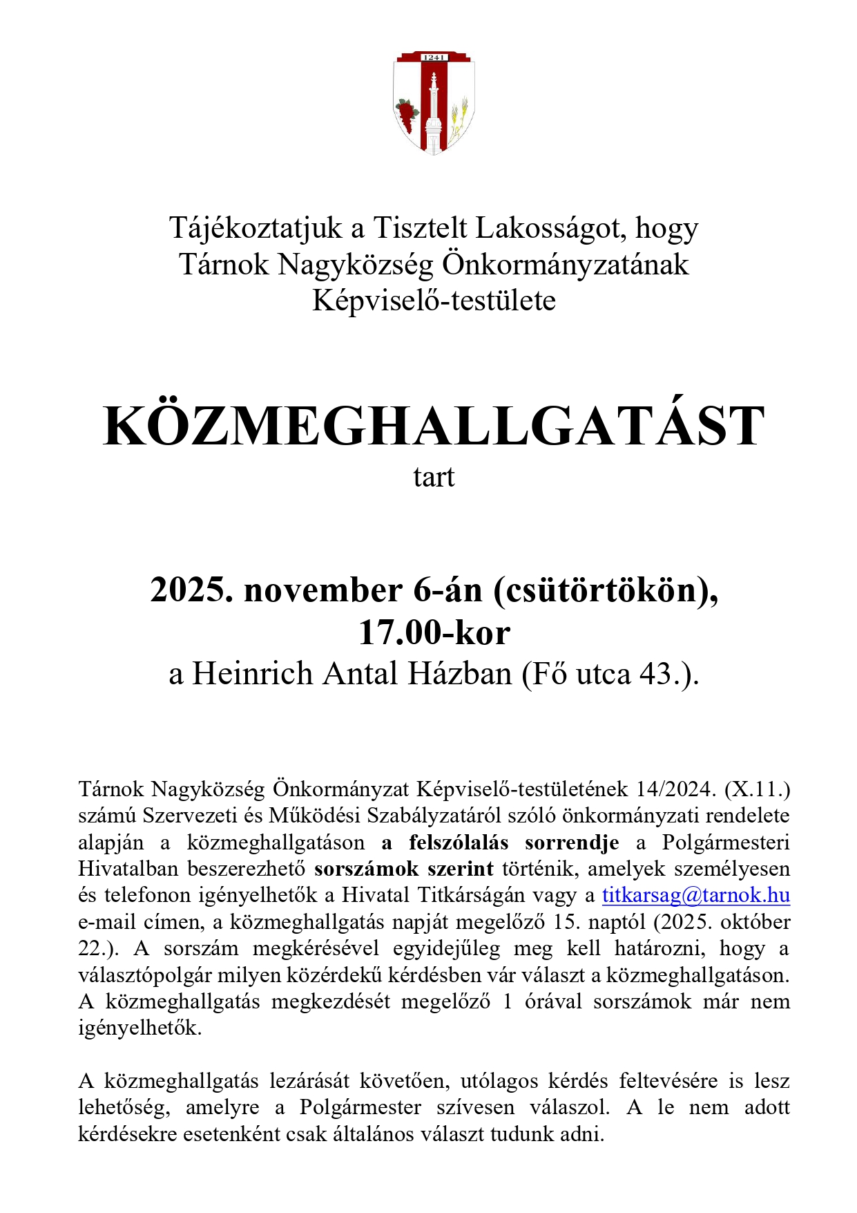 Tárnok Nagyközség Önkormányzat Képviselő-testületének 14/2024. (X.11.) számú Szervezeti és Működési Szabályzatáról szóló önkormányzati rendelete alapján a közmeghallgatáson a felszólalás sorrendje a Polgármesteri Hivatalban beszerezhető sorszámok szerint történik, amelyek személyesen és telefonon igényelhetők a Hivatal Titkárságán vagy a