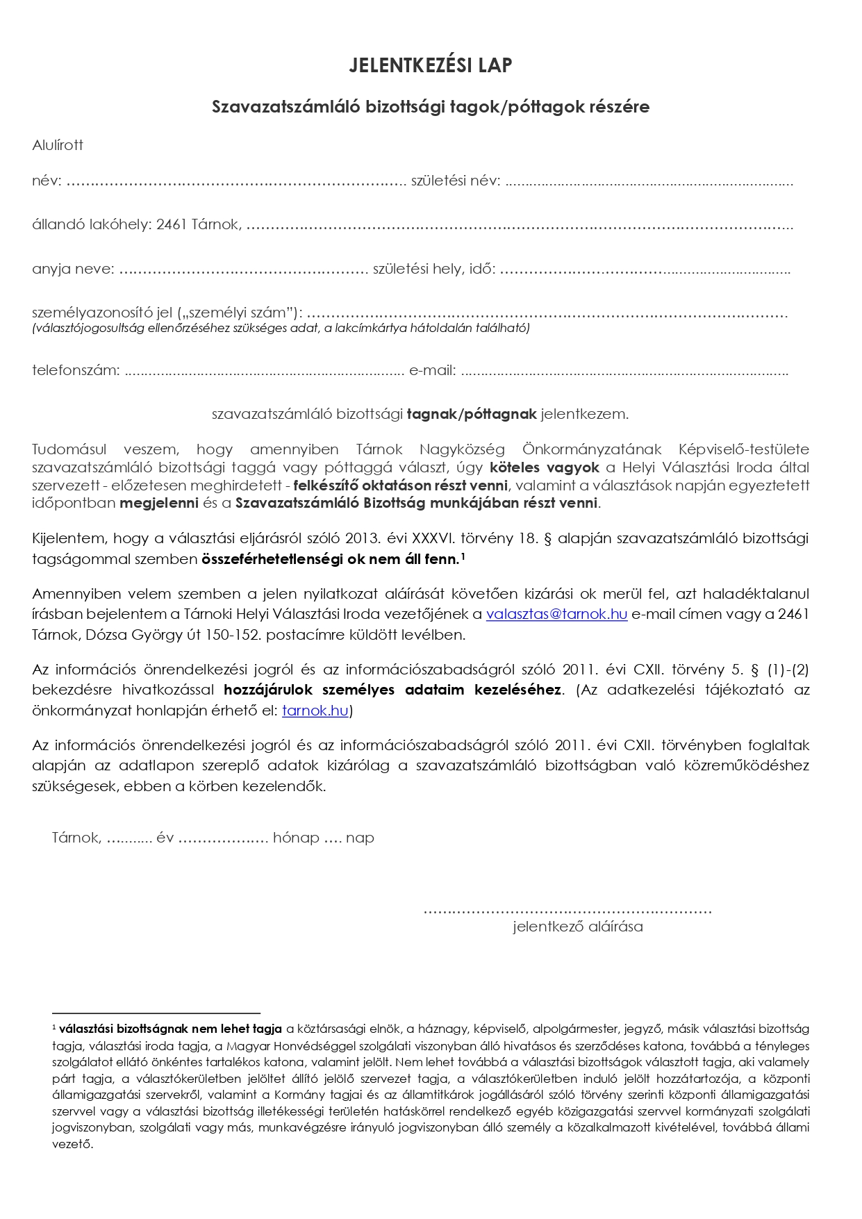 Választott szavazatszámláló bizottsági tagnak jelentkezni kizárólag az INNEN letölthető „Jelentkezési lap” nyomtatvány pontos kitöltésével lehet.